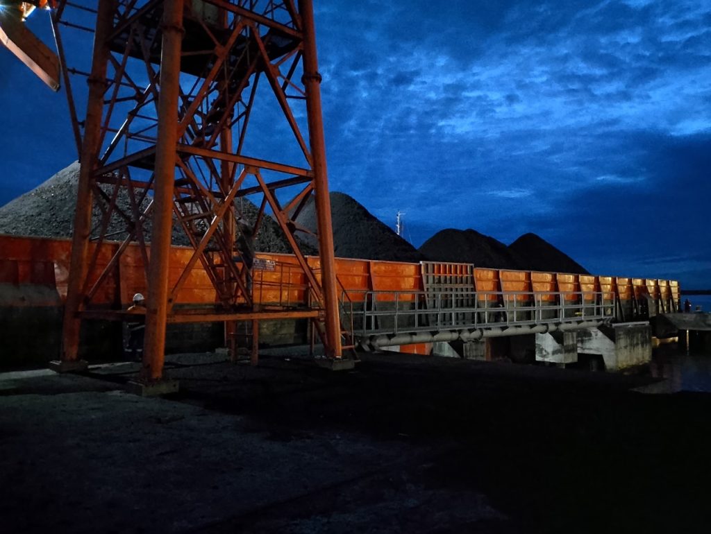 Proses bongkar muat batu bara di pelabuhan dilakukan dengan standar tinggi untuk efisiensi.